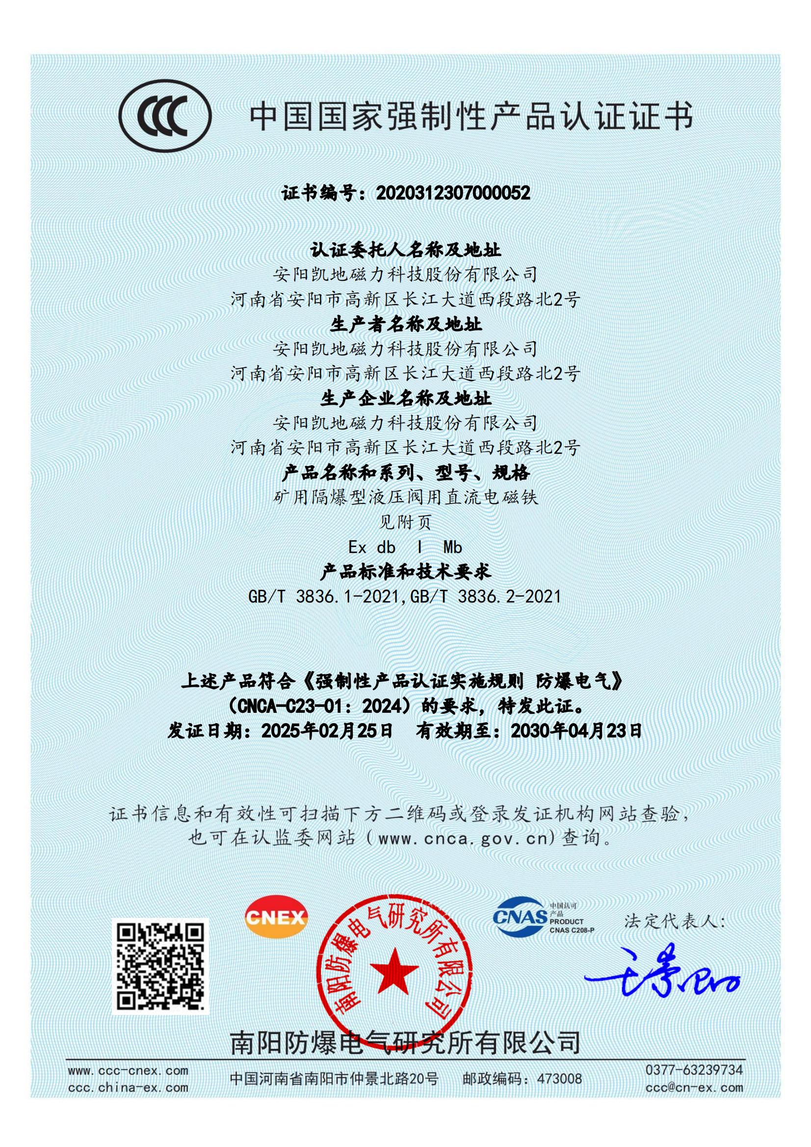 2020312307000052 矿用隔爆型液压阀用直流电磁铁CCC证书 有效期至2030年4月23日_01