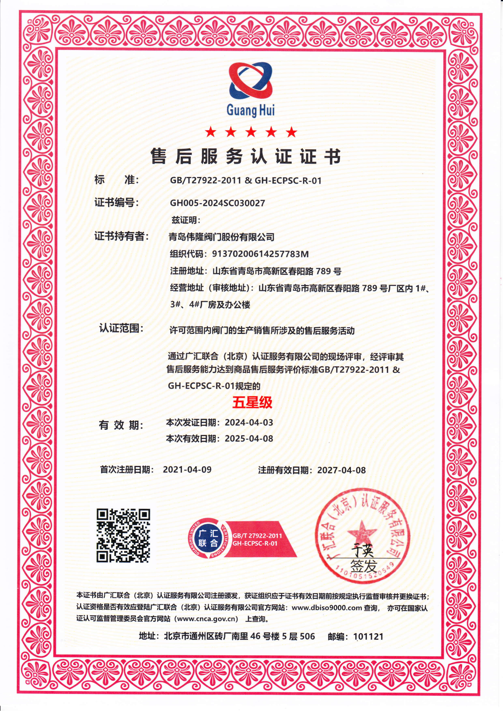 售后服务认证证书