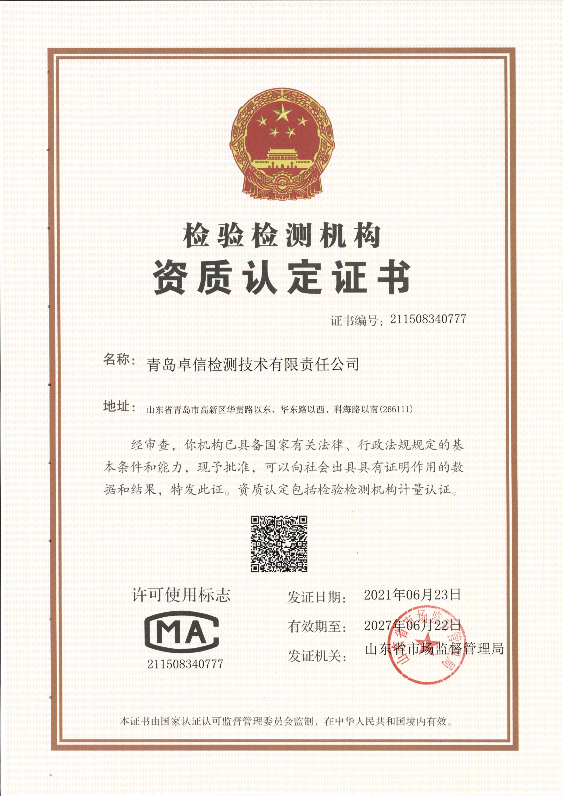 CMA资质认定证书
